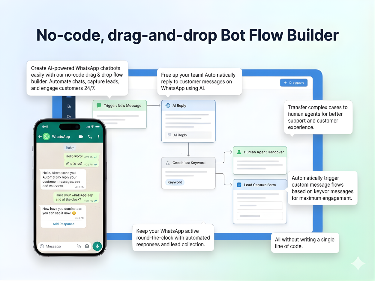 Create AI-powered WhatsApp chatbots easily with our no-code drag & drop flow builder. Automate chats, capture leads, and engage customers 24 7.